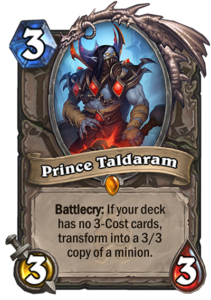 Prince Taldaram is a legendary neutral card from Knights of the Frozen Throne expansion. It is a three-mana 3/3 minion with a Battlecry to transform into a 3/3 copy of a minion if your deck has no three-cost cards in it.